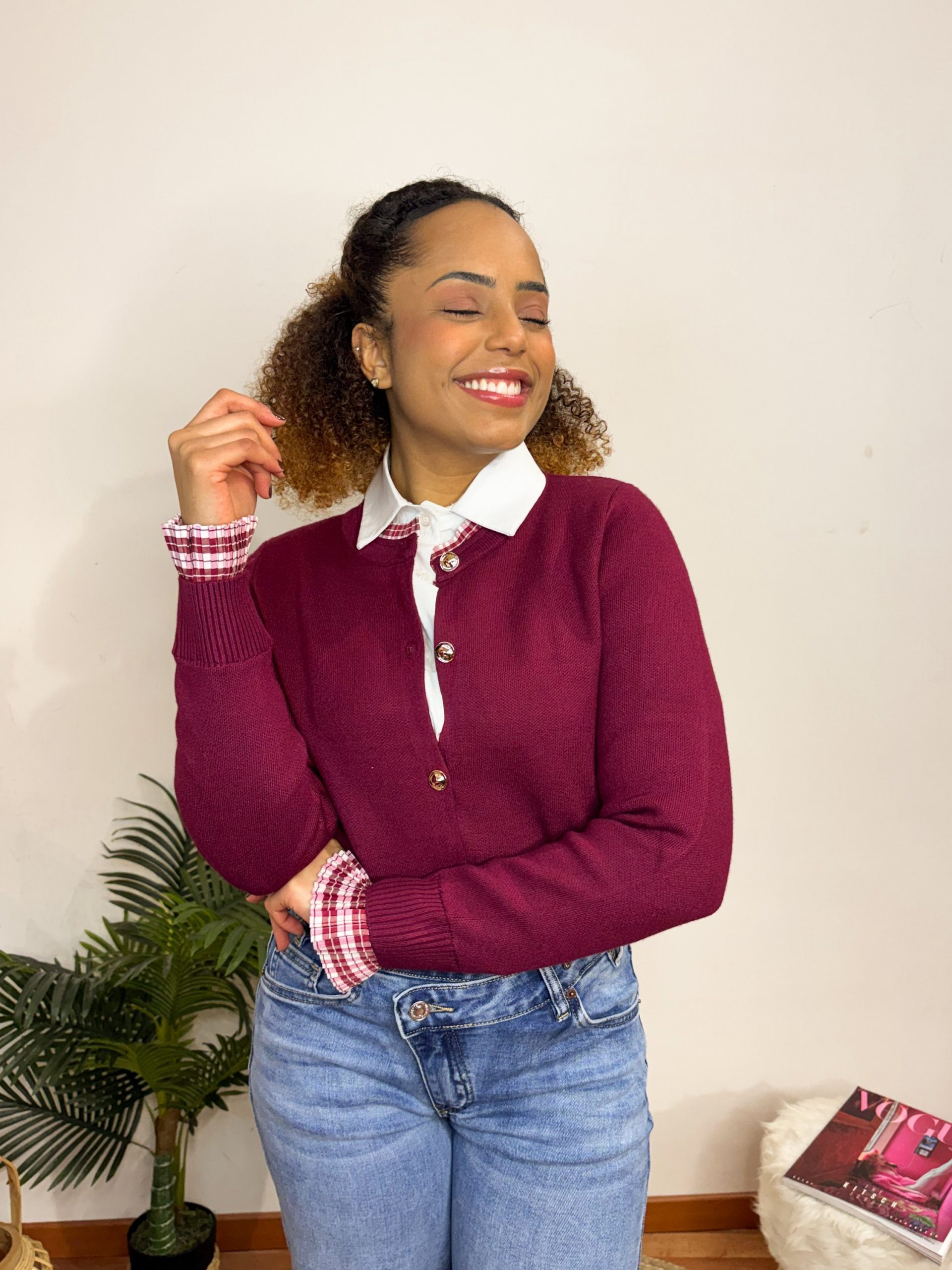Malha macia botões dourados, com padrão quadrado no decote e final da manga.
