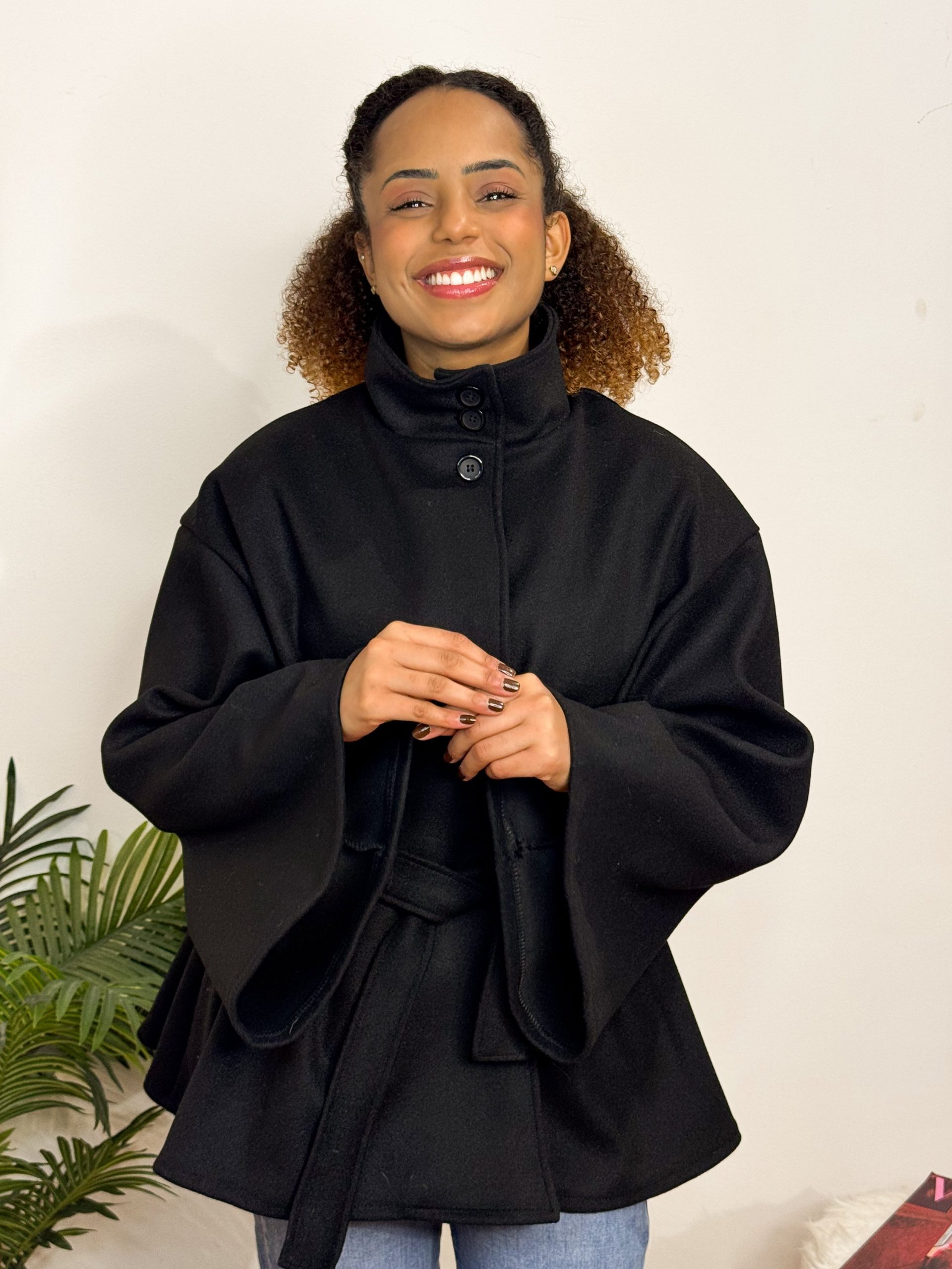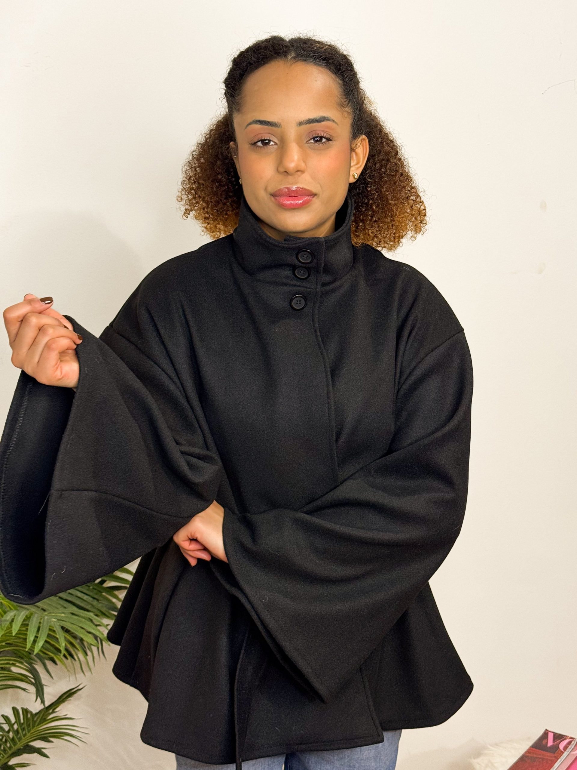 Casaco sobretudo com botões na gola para nos aconchegar. A manga morcego acresce largura até um XL.