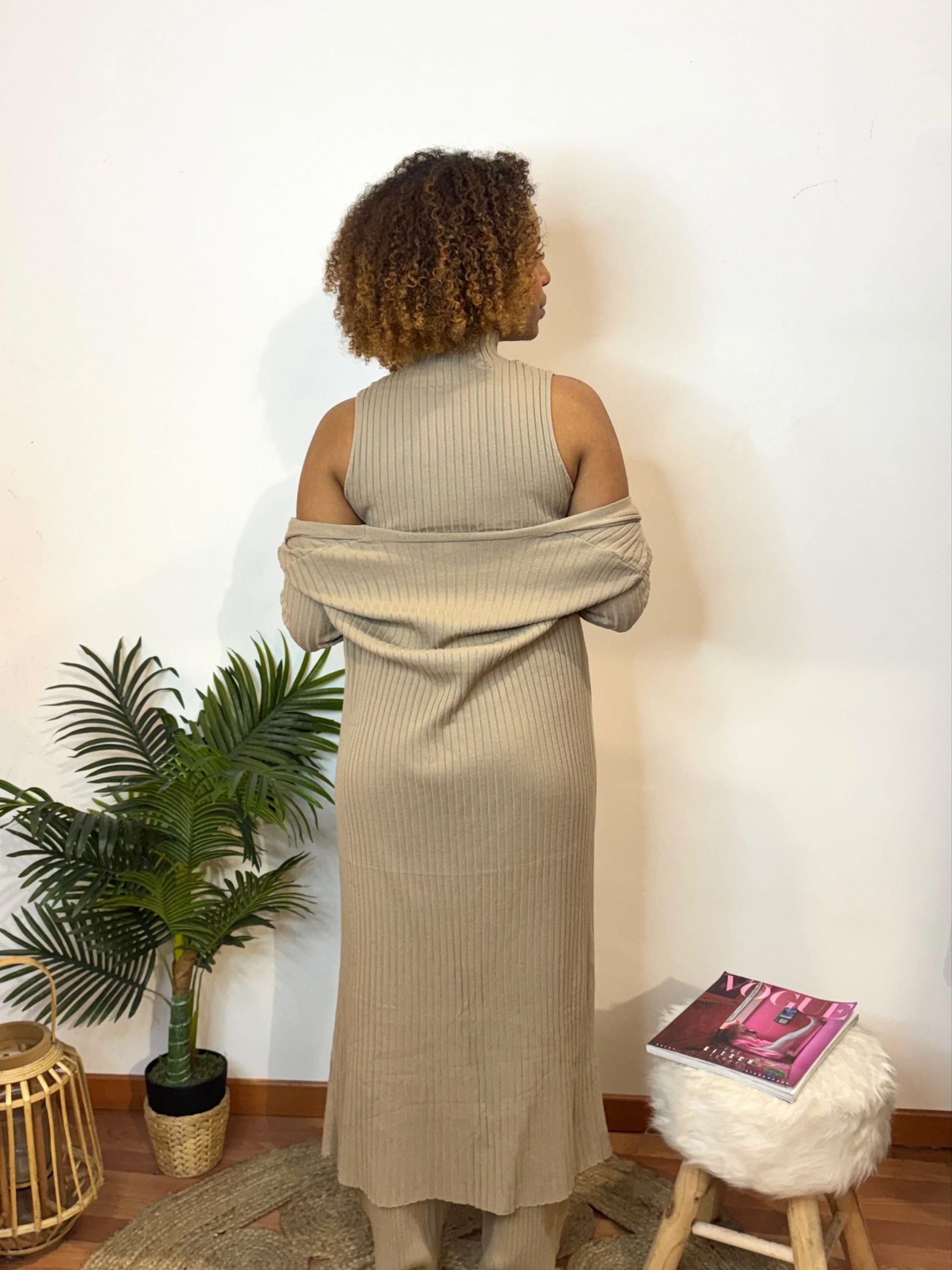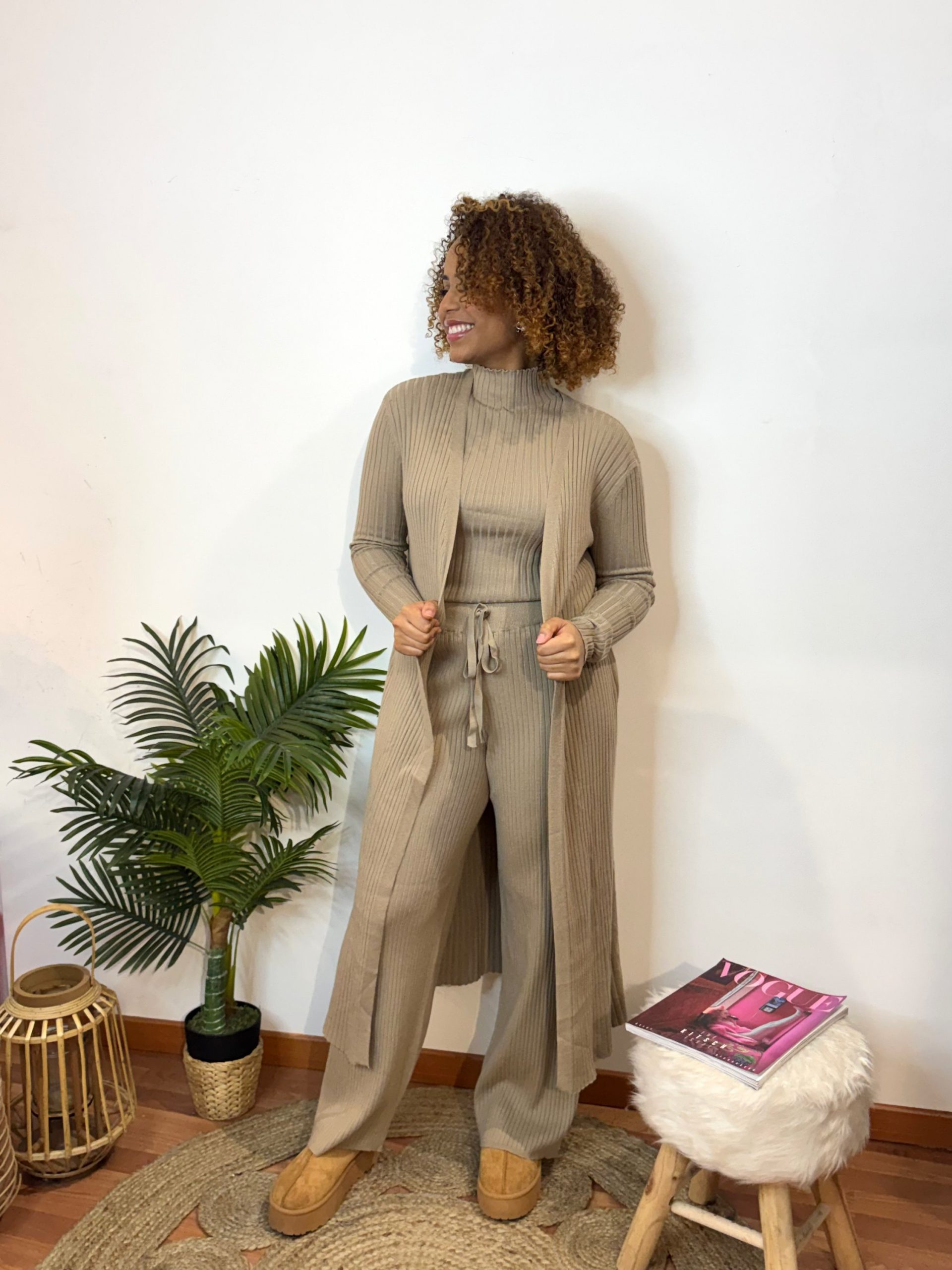 Conjunto Calça Jogger, camisola e casaco em malha canelada.