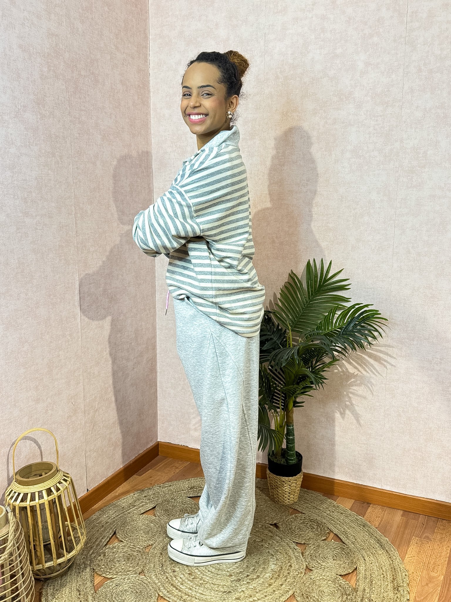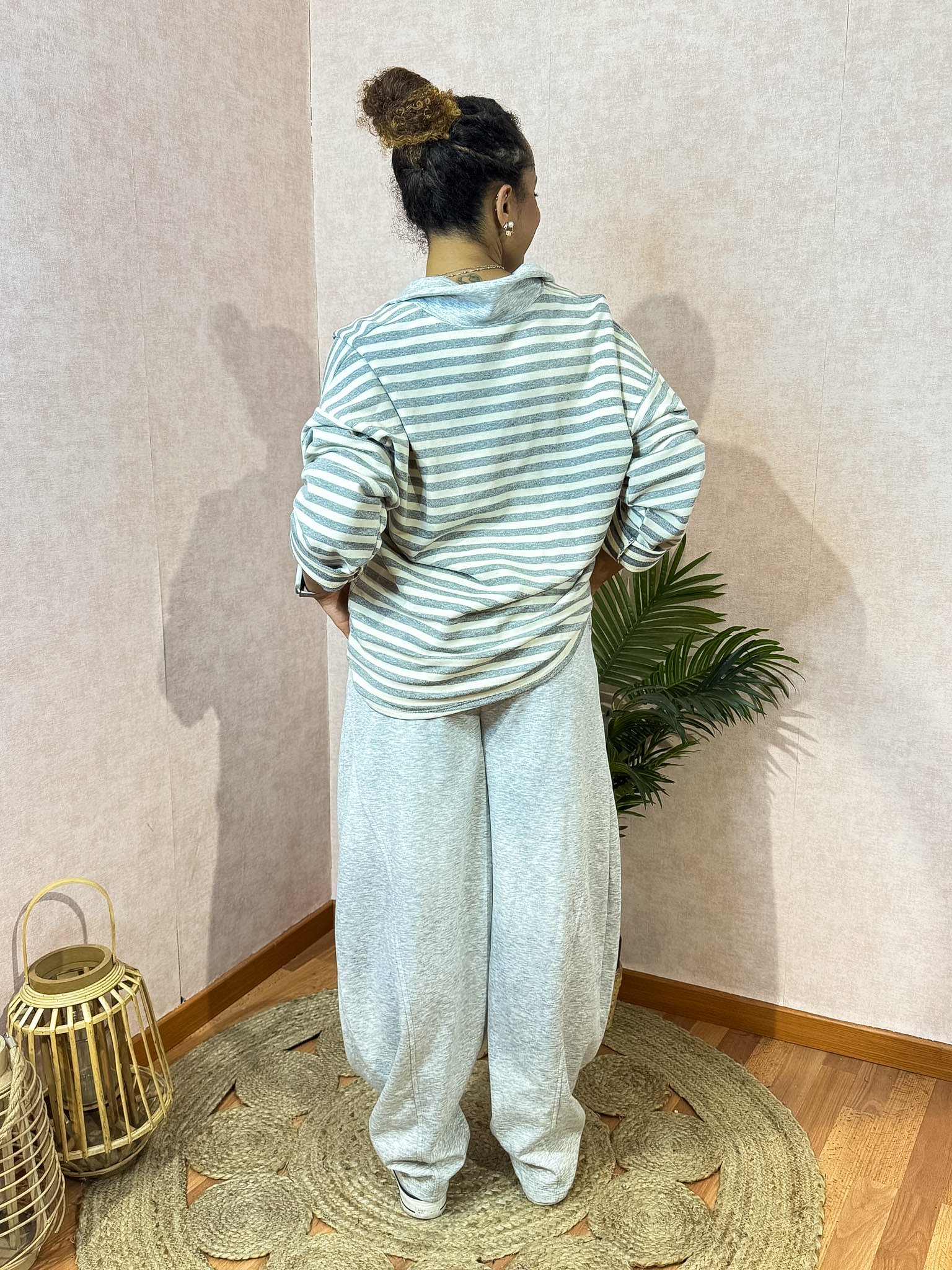 Camisola com risca em felpa com decote pólo e botões, veste oversized. A calça jogger tem perna larga, cós elástico com cordão ajustável e bolsos laterais.