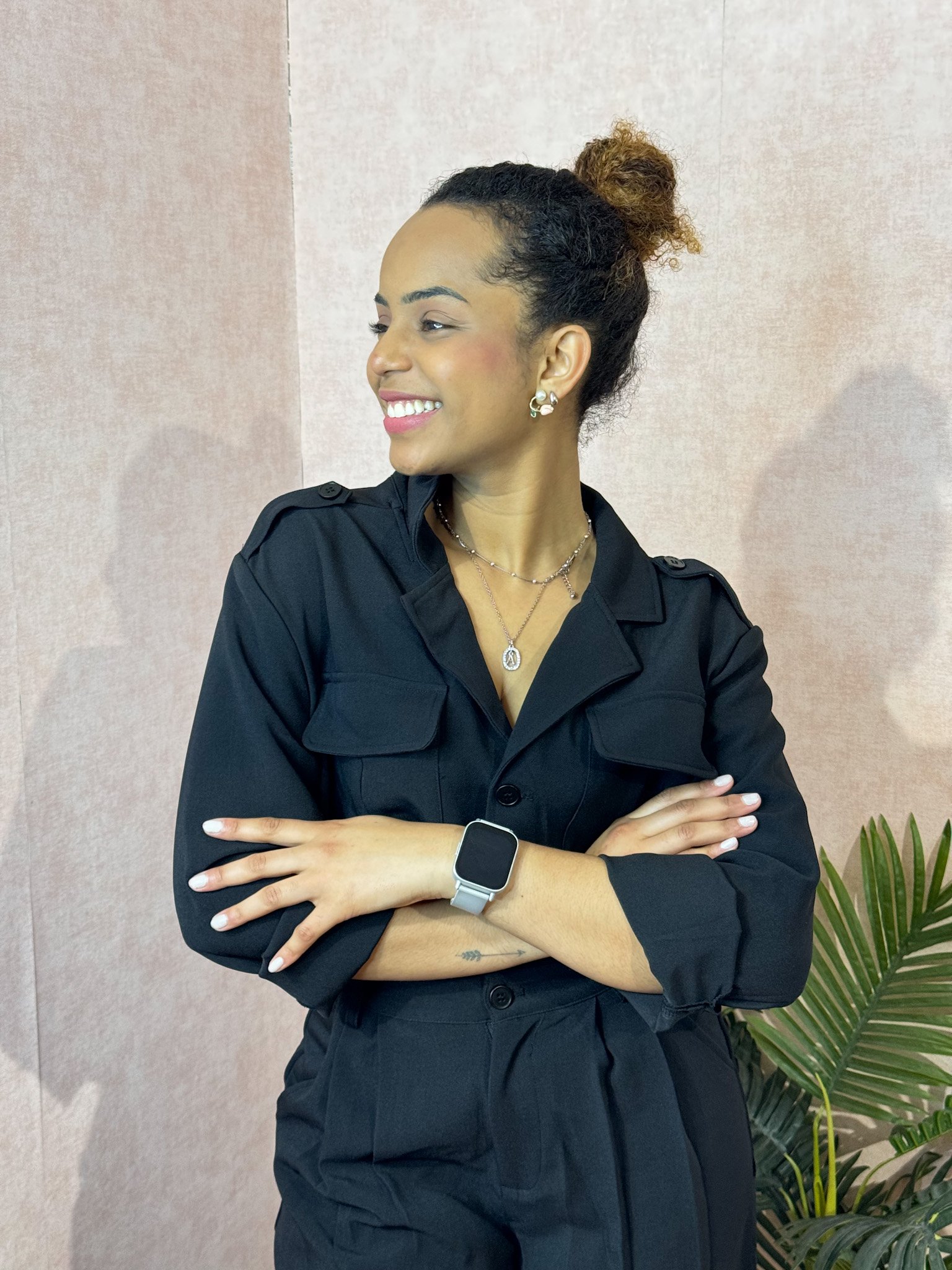 Jumpsuite sofisticado, toque pesado, alfaiataria de alta qualidade. Aperta com botão parte superior e tem bolsos na calça.