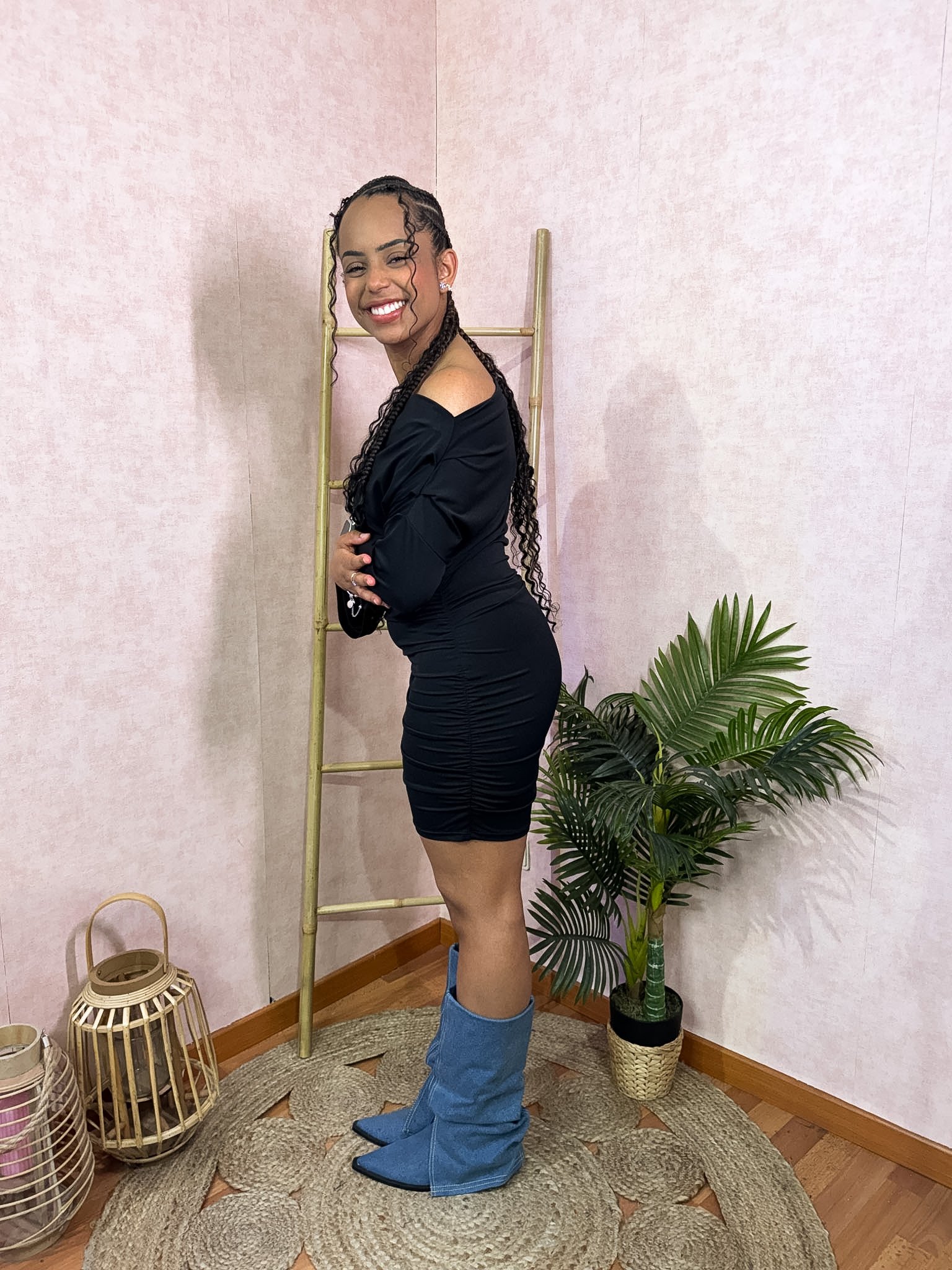 Vestido curto repuxado com elasticidade e decote em barco. Sem transparências.